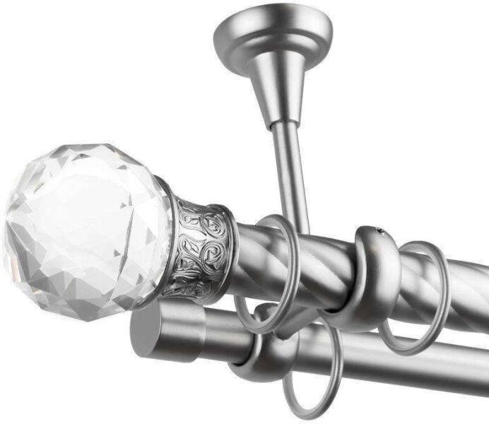 Odeon Dupla Csavart Galériarúd: Elegáns és Funkcionális Függönyrúd 400 cm Ez a dupla csavart galériarúd tökéletes választás elegáns és modern otthonokba. A 400 cm-es hosszúságú rúd elegendő helyet biztosít akár nagyobb ablakokhoz is. A krómozott ezüst szín kifinomult megjelenést kölcsönöz, miközben a tartós fém szerkezet hosszú élettartamot garantál. Jellemzők:Méret: 400 cm (a díszfejek hossza nem tartoz bele, 7 cm/db) Átmérő: 25/19 mm Szín: Ezüst krómozott Anyag: Fém Tartalmazza: Minden szükséges felszerelést a rögzítéshez (PVC gyűrűk, kapcsok) Középső kötés: A 300 cm-nél nagyobb rudaknál középen egy kötés található a stabilitás érdekében. Elegáns díszfejek: Kristály díszfejekkel ellátott, melyek csillogó megjelenést kölcsönöznek. Előnyök:Elegáns design: A csavart forma és a kristály díszfejek modern és stílusos megjelenést biztosítanak. Könnyű felszerelés: Minden szükséges tartozék a csomagban található. Tartós anyag: A minőségi fém garantálja a hosszú élettartamot. Tökéletes függönyökhöz: Elegáns megjelenést kölcsönöz függönyeinek. Mit kap a csomagban? 400 cm-es dupla csavart galériarudat Minden szükséges rögzítőelemet Két kristály díszfejet